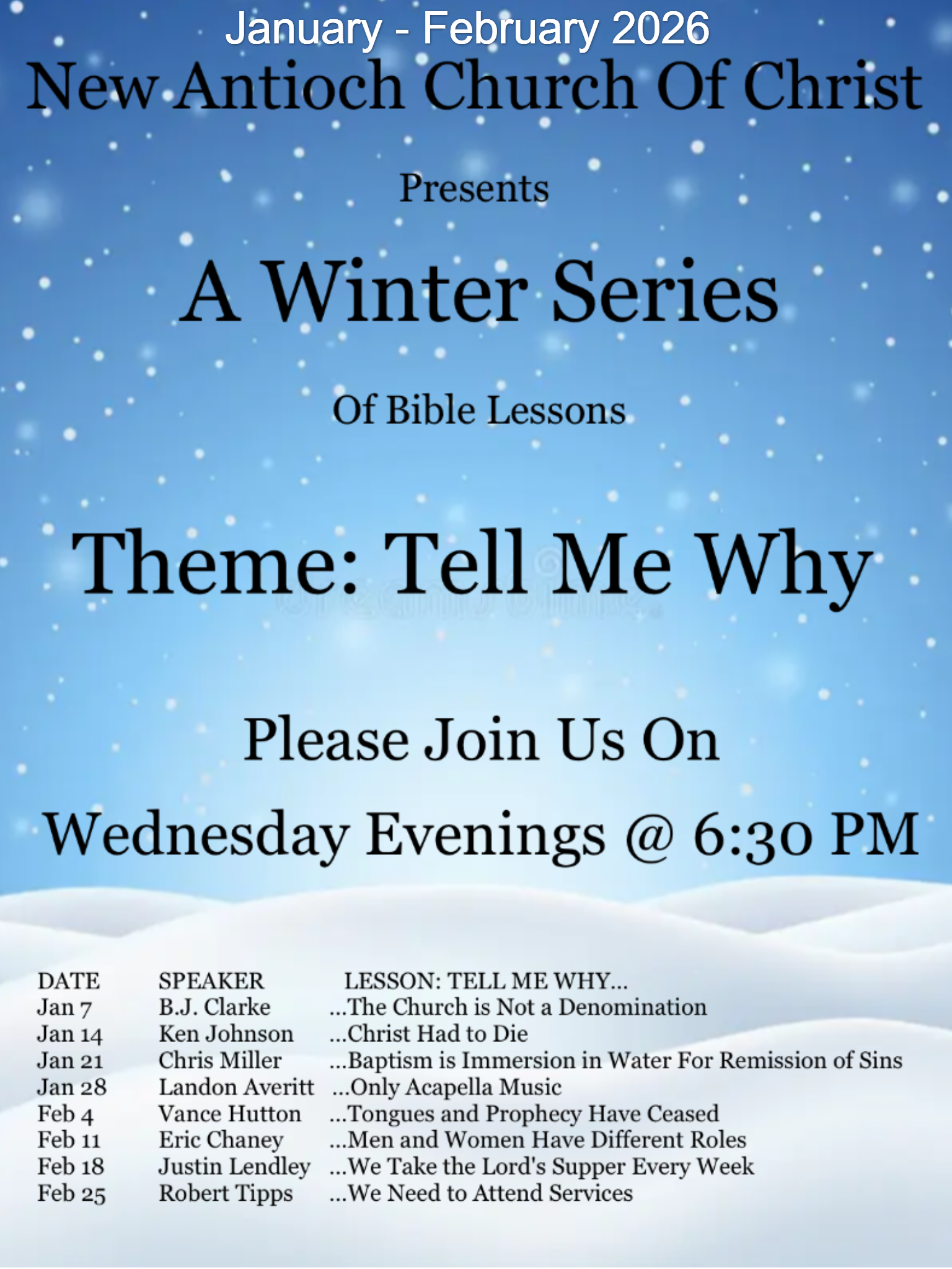 Starting in 2026, we at New Antioch, have instituted a new study effort called Winter Series. These are intended to be special lessons taking place on Wednesday evenings in January and February and focused on the theme for the year. Each series of lessons seeks to provide Biblically based insights into pertinent questions in today’s world. Lessons are presented by different evangelists and teachers who are recognized for their abilities in both knowledge and abilities. We invite everyone who wished to learn more about God’s Word to come and participate.